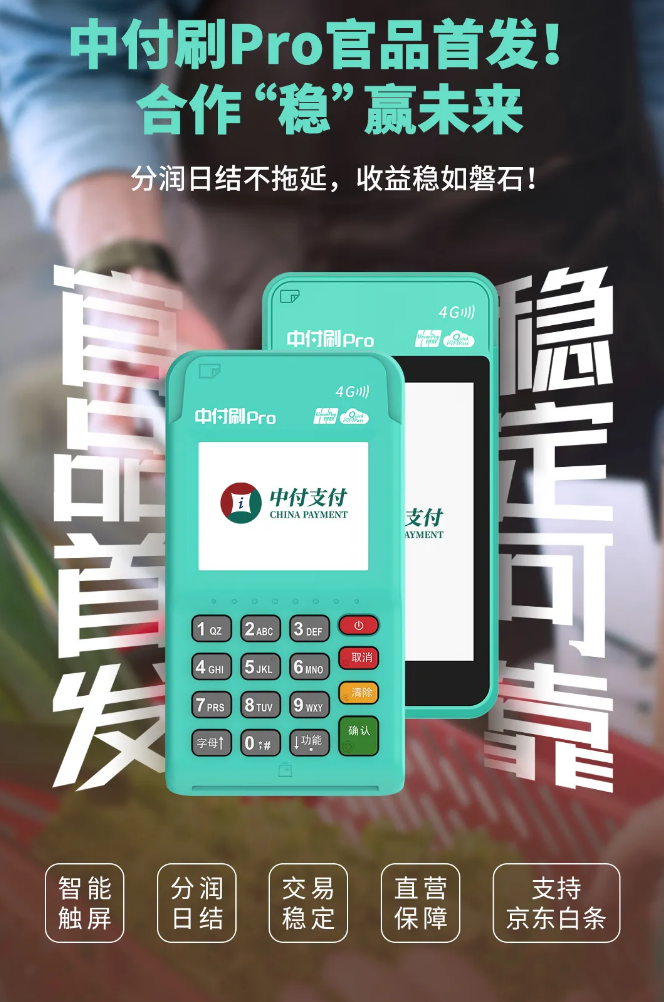 ✅ 分润日结 流水无忧 稳定的分润流水日结模式,交易数据透明可查,收益实时追踪,合作伙伴资金周转效率倍增。 ✅ 系统稳定 TOP级系统稳定性,高峰时段0卡顿 ✅ 京东生态 精准引流 中付刷Pro作为行业首批全渠道支持京东白条的官方POS终端 ,为合作伙伴提供独家拓客筹码,帮助您快速攻克零售、3C、医美等高净值行业客户。 ✅ 官方正品 稳定可靠 中付直营产品,政策持续性强,配套专属培训+物料支持+售后团队,助您抢占市场先机。 图片