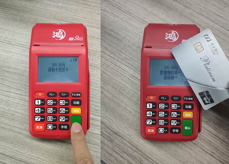 2.选择第一选项“消费”,并输入相应的收款金额以后,待系统提示“请刷卡或者挥卡”时,请把支持闪付功能的银行卡靠近鸿POS屏幕正上方,待POS机识别到了银行卡后会自动完成支付。1000以下的双免交易费率为银联的补贴费率0.38%,1000以上的双免交易按正常的刷卡费率核算。